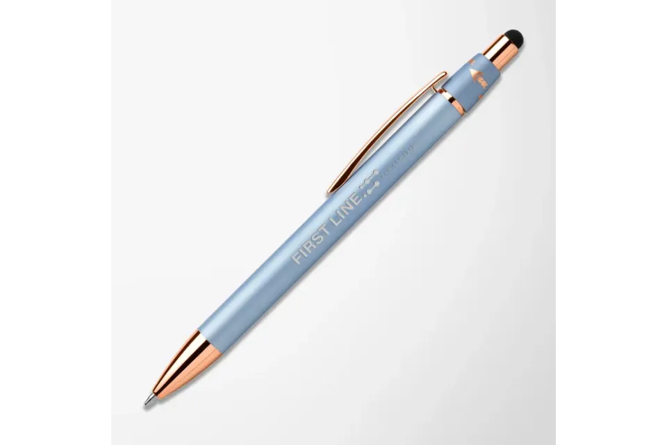 Una penna antistress così accattivante che tutti i tuoi clienti vorranno subito averne una! Per partecipanti ad eventi, studenti, clienti e pazienti che la useranno per scrivere su carta e su schermi touch e sfogare un po’ di energia negativa. Con fusto in metallo con finitura soft touch perlata e un corpo rotante antistress sullo stantuffo per renderla assolutamente irresistibile. Il corpo rotante antistress è dotato di frecce direzionali oro rosa in coordinato con la finitura oro rosa della penna. La punta touch nera aumenta la funzionalità della penna e la visibilità del tuo brand.